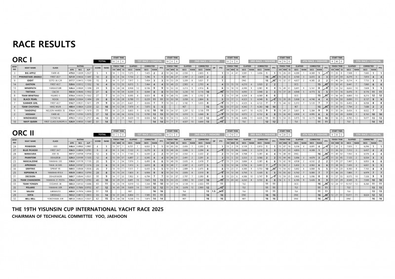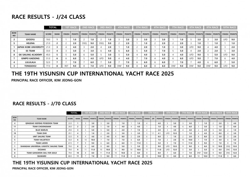 제19회 이순신장군배 국제요트대회 경기성적